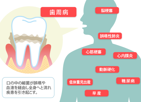特に歯周病は、血糖値を下げるインスリンの働きを悪くさせたり(糖尿病)、早産・低体重児出産・肥満・血管の動脈硬化(心筋梗塞・脳梗塞)にも関与しています。